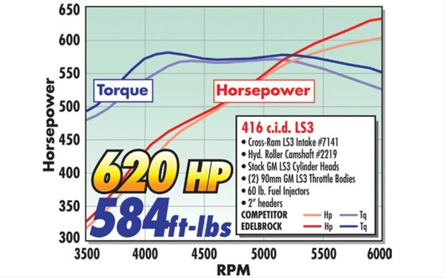 Edelbrock part #71413 LS3 Cross-Ram intake manifold is designed for Gen IV engines with LS3, L92 and L76 rectangular port cylinder heads. The Cross-Ram LS3 is ideal for anybody looking to combine great looks and outstanding performance between 1,500 - 7,000 rpm. The unique dual-plenum design features 13" long runners with flanges that will accept two, 90mm GM LS3 throttle bodies. The cross-ram dual-plenum design is ideal for twin turbo applications. When matched with high flowing air filters and inlet tubes, the dual-plenum system gives neck-snapping performance with plenty of options for engine builders and tuners. Dyno testing resulted with gains of 27 horsepower and 28 ft-lbs. of torque over a popular aftermarket manifold.